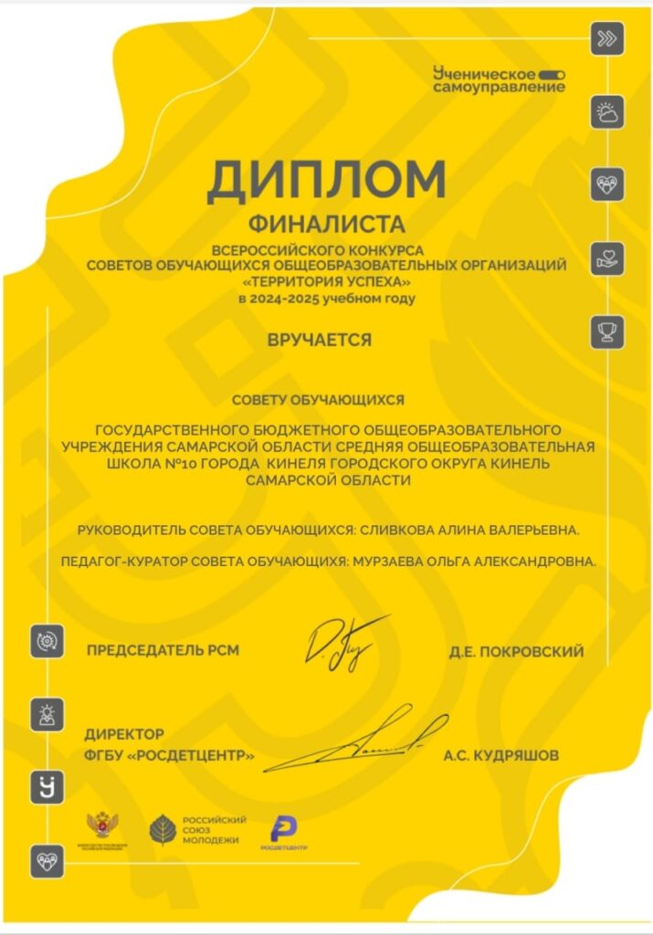 С 16 по 19 сентября 2025 года активисты ученического совета «Содружество» ГБОУ СОШ № 10 города Кинеля (Сливкова Алина, Тихонова Мария, Кудашкина Ксения, Мурзаева Юлия), под руководством советника директора по воспитанию и взаимодействию с детскими общественными объединениями Мурзаевой Ольгой Александровной,  приняли участие во Всероссийском слете «Выбираем будущее» в г. Москва в рамках реализации всероссийской программы по развитию советов обучающихся «Ученическое самоуправление» общероссийской общественной организации «Российский Союз Молодёжи».