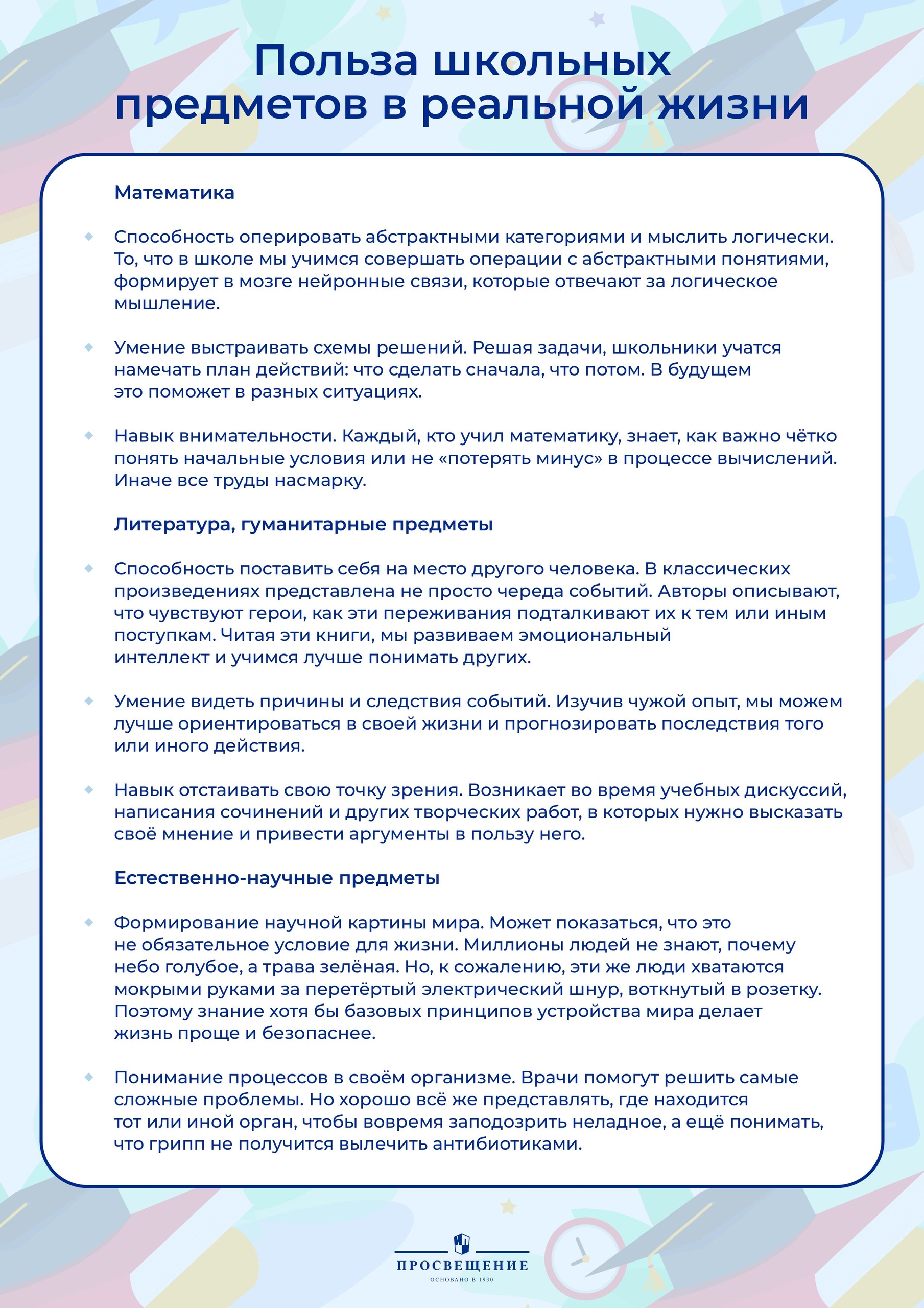 Бывает ли, что ученики спрашивают вас, зачем им изучать косинусы или имена царей? В памятке рассказывается, какие навыки и способности, необходимые каждому, развивают разные школьные предметы.