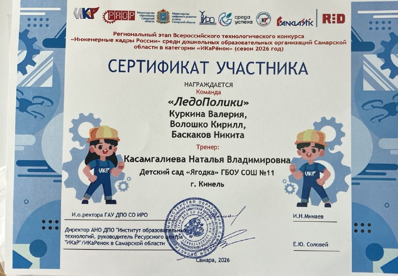 Команда из детского сада «Ягодка» города Кинеля удивила всех Валерией Куркиной, Кириллом Волошко и Никитой Баскаковым. Их наставником стала Наталья Владимировна Касамгалиева, яркий инструктор по физической культуре детского сада «Ягодка».