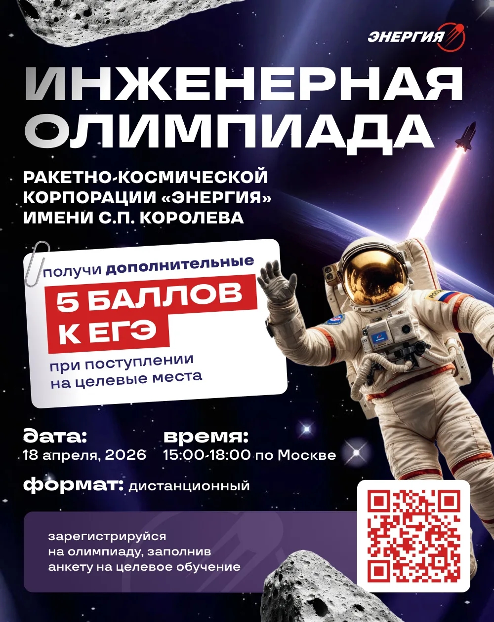 Ракетно-космическая корпорация «Энергия» им. С.П. Королёва открыла регистрацию на инженерную олимпиаду, пройдя которую можно будет получить 5 дополнительных баллов к результату ЕГЭ при поступлении на целевые места от «Энергии».