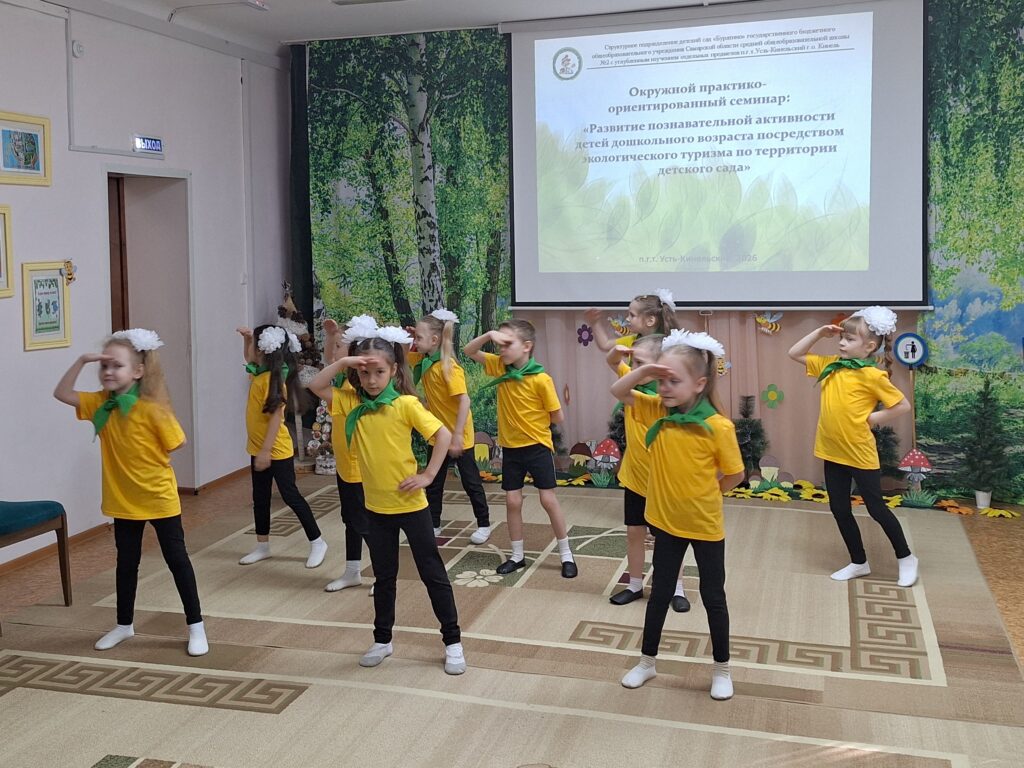 Воспитанники старшей группы «Солнышко» открыли семинар, исполнив гимн, посвященный Эколятам. Затем дети из второй младшей группы «Ромашка» показали театрализованное представление «Экологическая сказка „Случай на полянке“». Этот номер ярко продемонстрировал, как природные мотивы можно использовать в образовательном процессе.