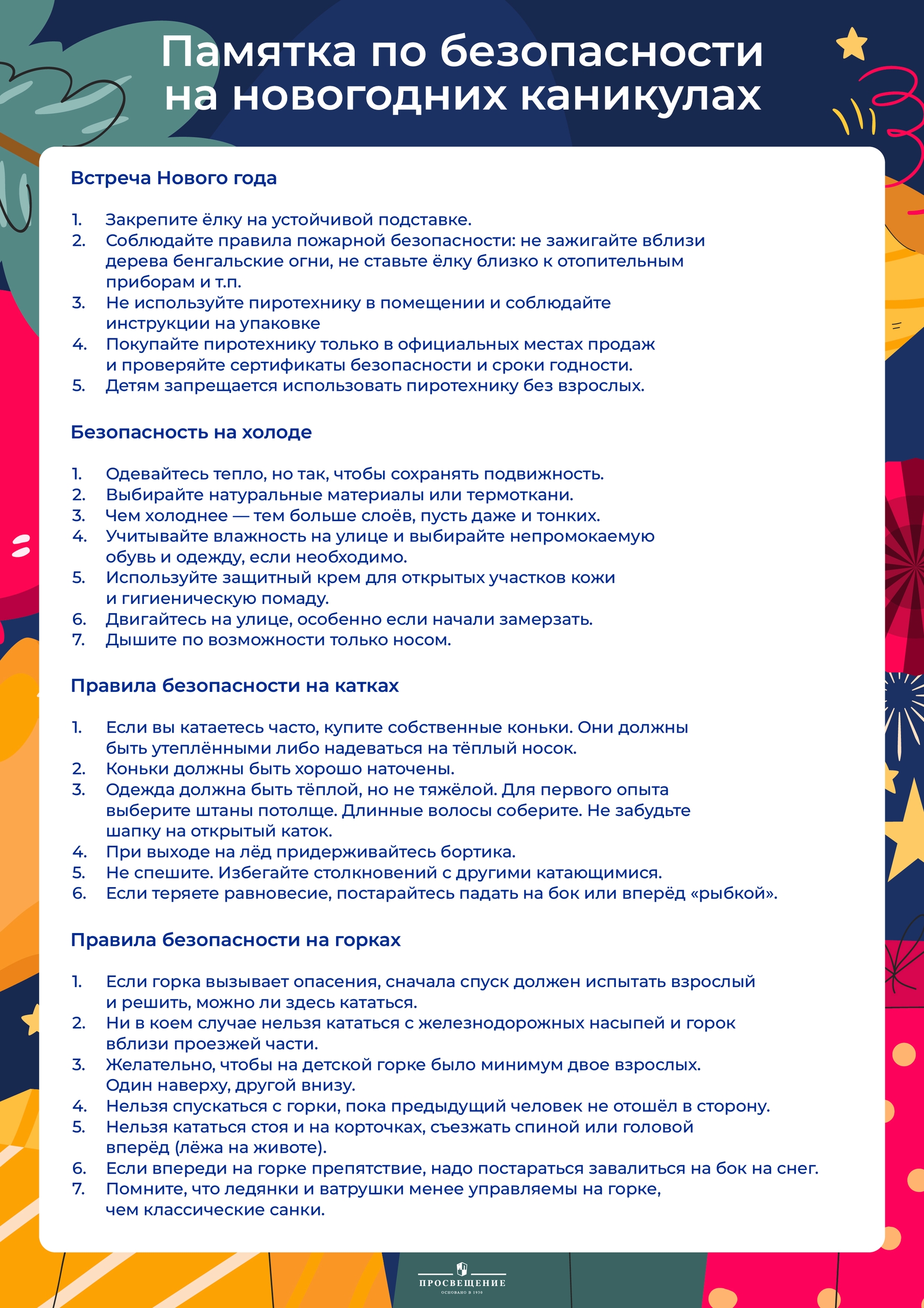 Впереди длинные зимние каникулы. Перед ними стоит напомнить ребятам правила безопасности, которые важно соблюдать в новогодние праздники и вообще в холодное время года. Оформили их в виде памятки. Вы можете…